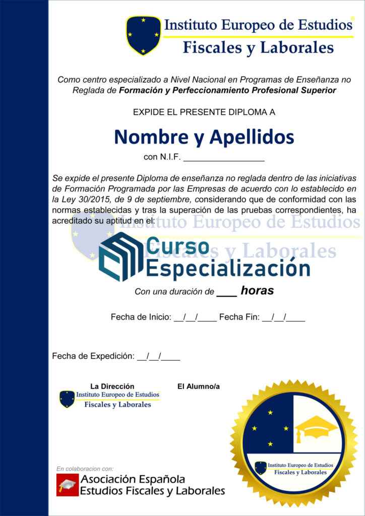 *Título Privado Expedido por el Instituto Europeo de Estudios Fiscales y Laborales (IEFL) Para la obtención del Diploma acreditativo es necesario haber realizado y superado en el porcentaje requerido de las pruebas de evaluación propuestas con carácter obligatorio asociadas al programa formativo. Este diploma es de enseñanza no reglada y sin carácter oficial, como Formación Especializada en el Perfeccionamiento Profesional, formando parte en su Currículum Vitae en el apartado de formación complementaria.