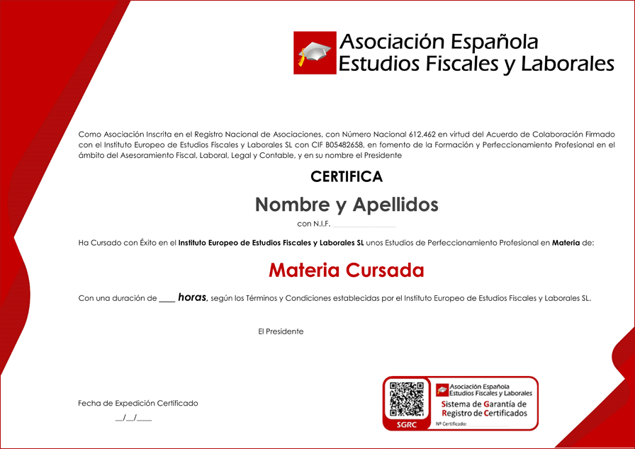 La Asociación Española de Estudios Fiscales y Laborales certifica, en las condiciones del Acuerdo suscrito entre ambas entidades, la Formación impartida para el Perfeccionamiento Profesional por el Instituto Europeo de Estudios Fiscales y Laborales (IEFL).